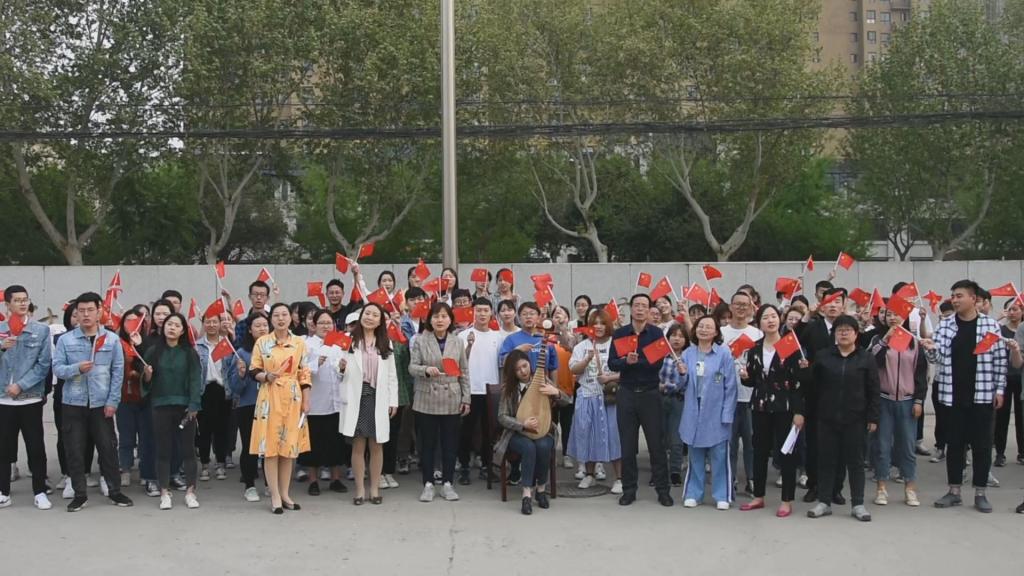 上午10点01分,温暖、动人的旋律分别在国旗下、综合楼前响起,伴随着基础部青年教师侯清睿的琵琶、皮颖老师的钢琴和图书馆赵幽兰老师的小提琴,团委书记窦曼娟、信网中心樊婷婷、基础部崔斗等老师带头唱响了《我和我的祖国》。一时间,歌声在国旗下回响,在综合楼前环绕,正值课间休息的老师和同学们受到感召,纷纷围观并情不自禁地加入歌唱队伍。大家手持国旗,从各处聚集而来,簇拥在领唱及合唱团老师身边,他们精神饱满地挥舞手臂,舞动国旗,高声合唱,场面壮观、气氛热烈。