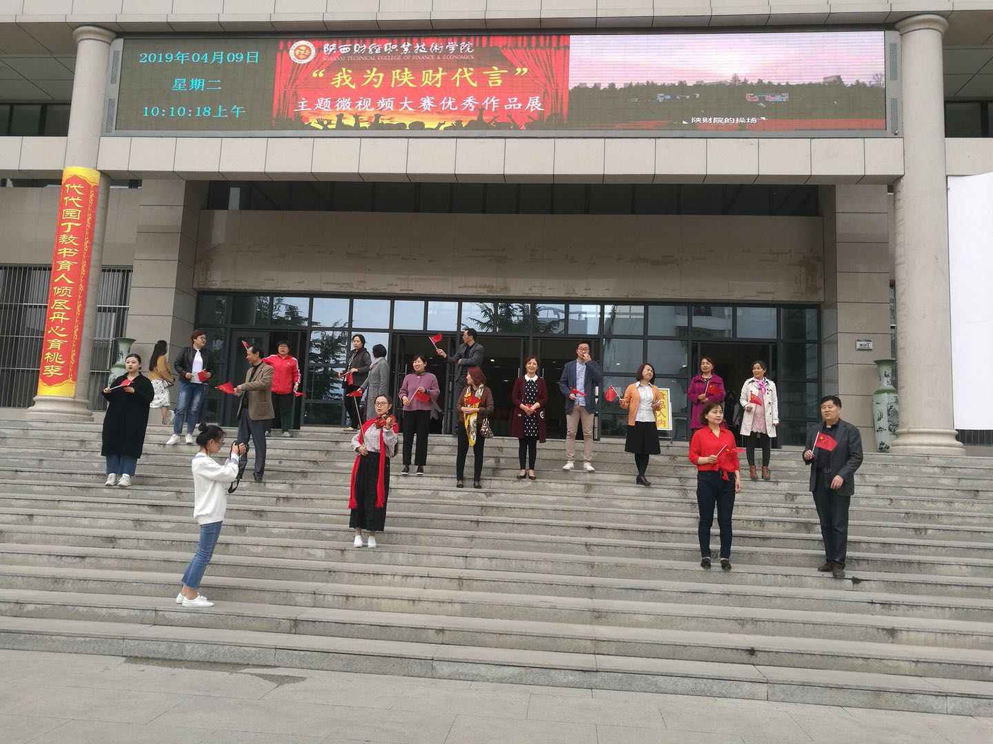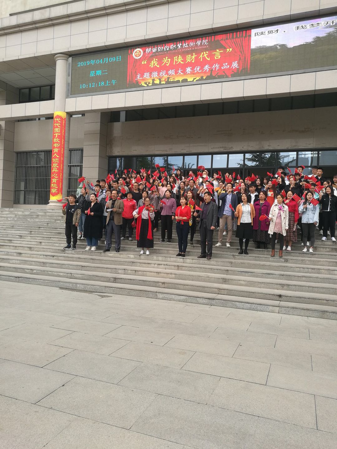2019年4月9日,为庆祝中华人民共和国成立七十周年,由基础部教师倡议组织,在团委及教师合唱团的大力支持下,陕西财经职业技术学院快闪——歌唱《我和我的祖国》活动在校园中进行,吸引了众多师生热情参与。