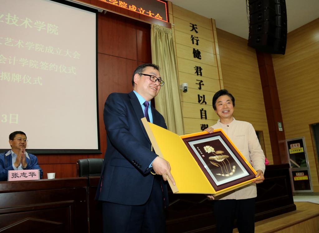副院长刘晓玉宣读了学院内设机构名称变更和有关聘任的文件,学院原基础课教学部更名为人文艺术学院;聘请贺兴文为人文艺术学院院长;王玉芳、陈美玲、曹书生、吕九鹏等4人为我院客座教授。程书强代表学院为贺兴文和受聘的客座教授颁发了聘书。随后,书记张志华、院长程书强分别与贺兴文为人文艺术学院、贺兴文大师工作室揭牌。
