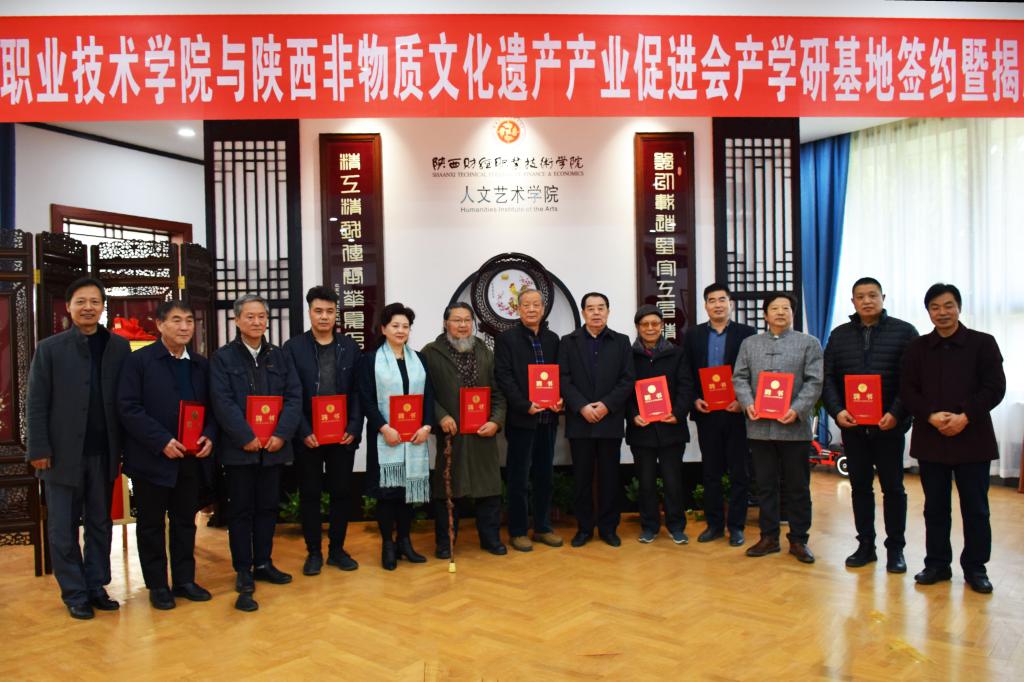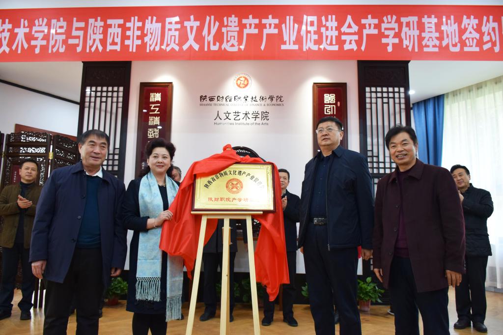 随后我院党委张志华书记,人文艺术学院院长,全国工艺美术大师贺兴文先生与陕西非物质文化遗产产业促进会会长袁红女士共同为陕西财经职业技术学院与陕西非物质文化遗产产业促进会产学研基地进行隆重的揭牌仪式。双方共同交换签署了合作协议。