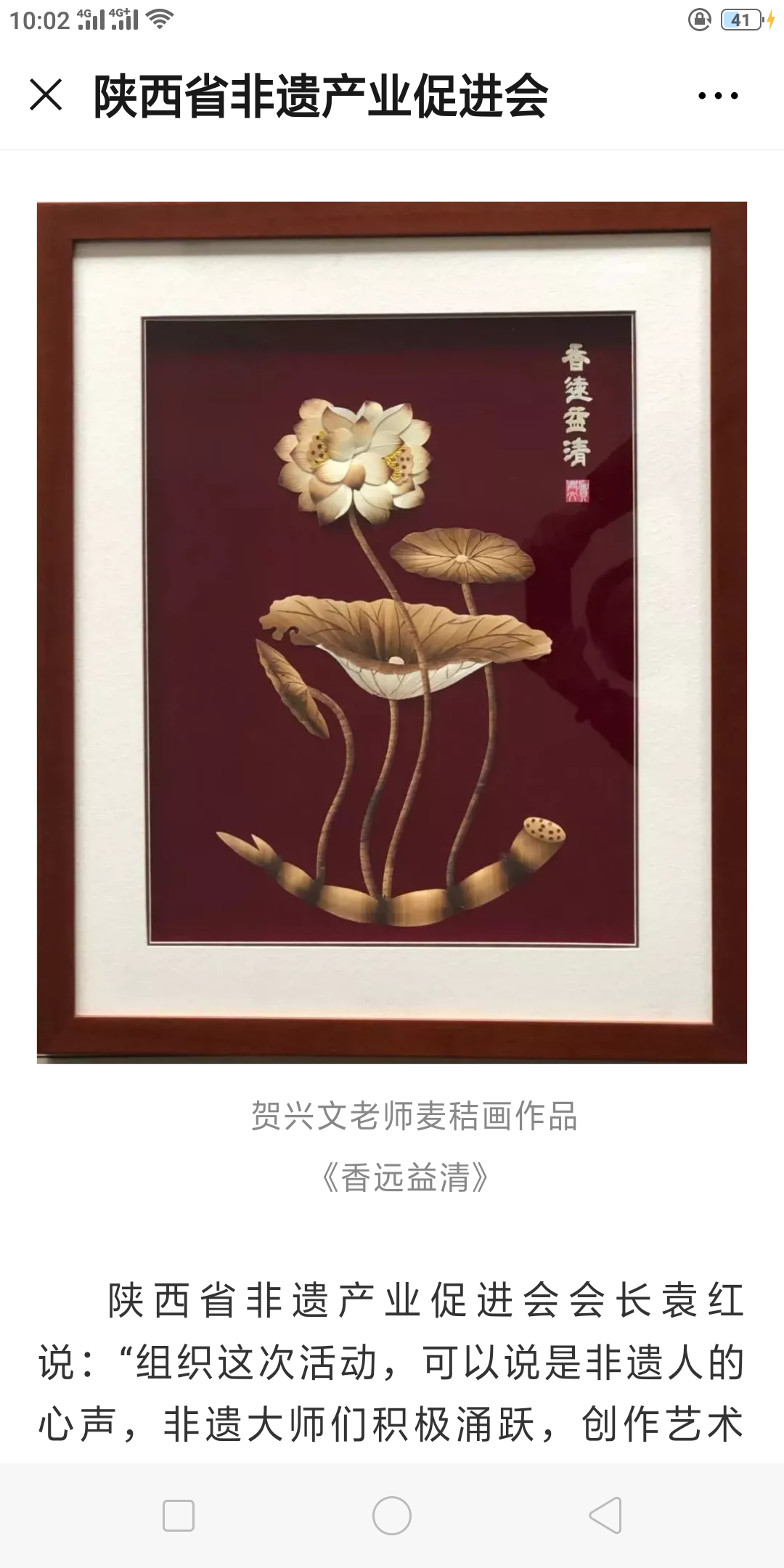 1月29日,陕西省非遗产业促进会向广大非遗艺术家发出《创作非遗精品,向抗疫‘最美的逆行者’献爱心》的活动倡议,倡议发出后,三秦非遗传承人一呼百应,积极响应,纷纷表示要创作艺术精品,为抗疫英雄奉献爱心,为抗击疫情工作贡献绵薄之力。贺院长的《香远益清》麦秆画作品入选馈赠艺术佳作。我省华州皮影国家级代表性传承人汪天稳、凤翔泥塑国家级代表性传承人胡新明、耀州瓷国家级代表性传承人孟树锋、户县农民画一级画家王乃良、省人大代表羌绣传承人王小琴、社火马勺脸谱大师李继友、剪纸大师田亚莉等数十位来自全省各地非遗传承人踊跃参加。