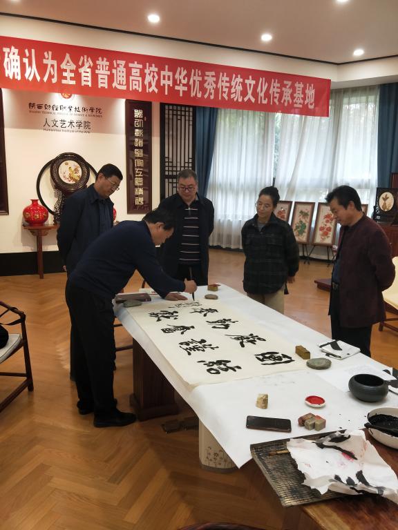 11月11日下午,渭南著名书法家曹书生先生一行四人莅临我院开展文化交流活动。曹书生先生在贺兴文大师工作室挥毫泼墨,书写了书法作品,还特意书写了学院校训、学院精神等作品。学院党委书记张志华、院长程书强、中国工艺美术大师、人文艺术学院院长贺兴文参加了本次文化交流活动。