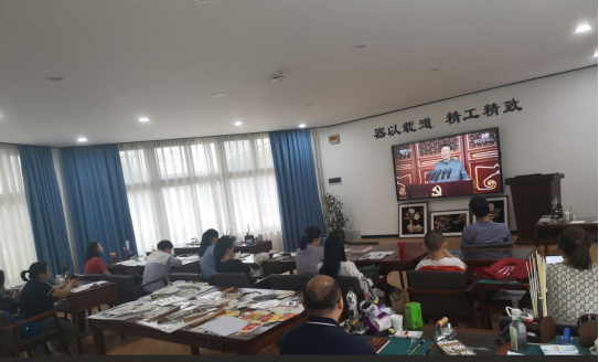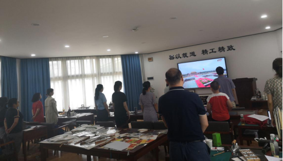 人文艺术学院党支部全体党员于2021年7月1日早上8点在艺术教学区集中收看了庆祝中国共产党成立100周年大会直播,除有课教师外支部所有党员均参加观看。