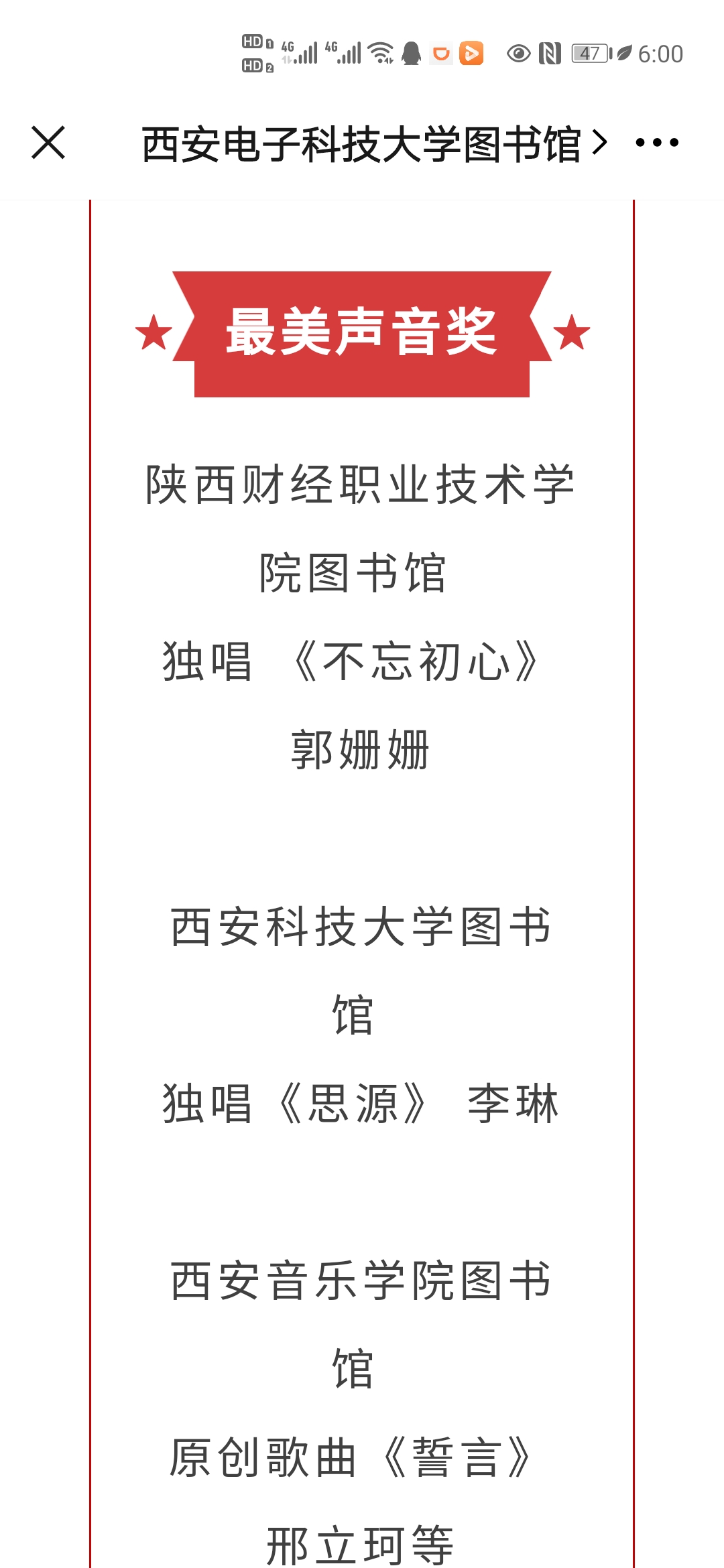 为庆祝中国共产党百年华诞,陕西高校图工委特组织了“唱支山歌给党听——陕西高校图书馆红歌云展播”活动。学院图书馆积极参加、静心准备,五个参赛作品全部获奖,其中郭珊珊的独唱《不忘初心》获得最美声音奖。