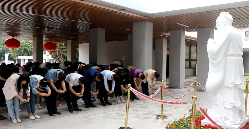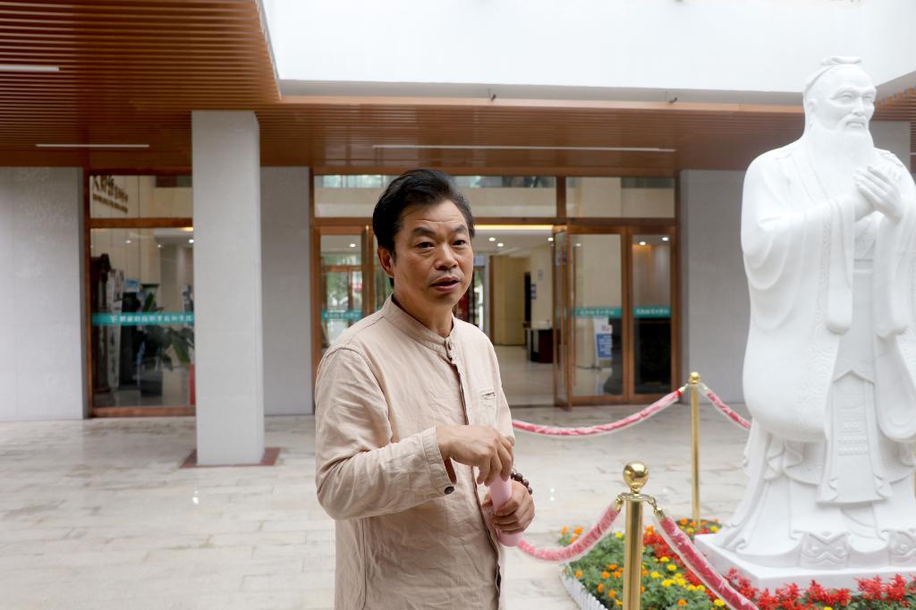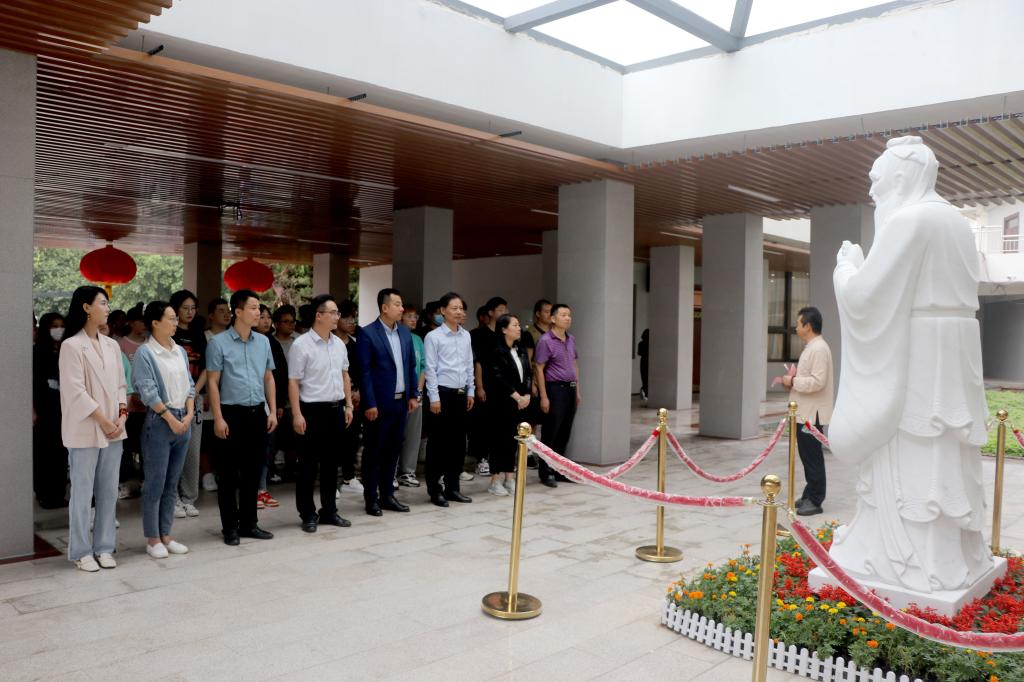 随后,大家移步实训楼前的孔子塑像前,举行了拜师礼。拜师礼仪式由贺兴文院长主持,他首先阐述了孔子在中国文化方面的重要地位,以及我们现在尊孔、拜师的意义,随后,全体人员在贺兴文大师的带领下,肃正衣冠对孔子雕像行三鞠躬礼,表达对祖国的热爱,对先贤的尊敬和对学校未来的期盼之情。新生代表还带领大家齐声诵读了《论语十则》,千年前的谆谆教诲久久萦绕在师生耳边。