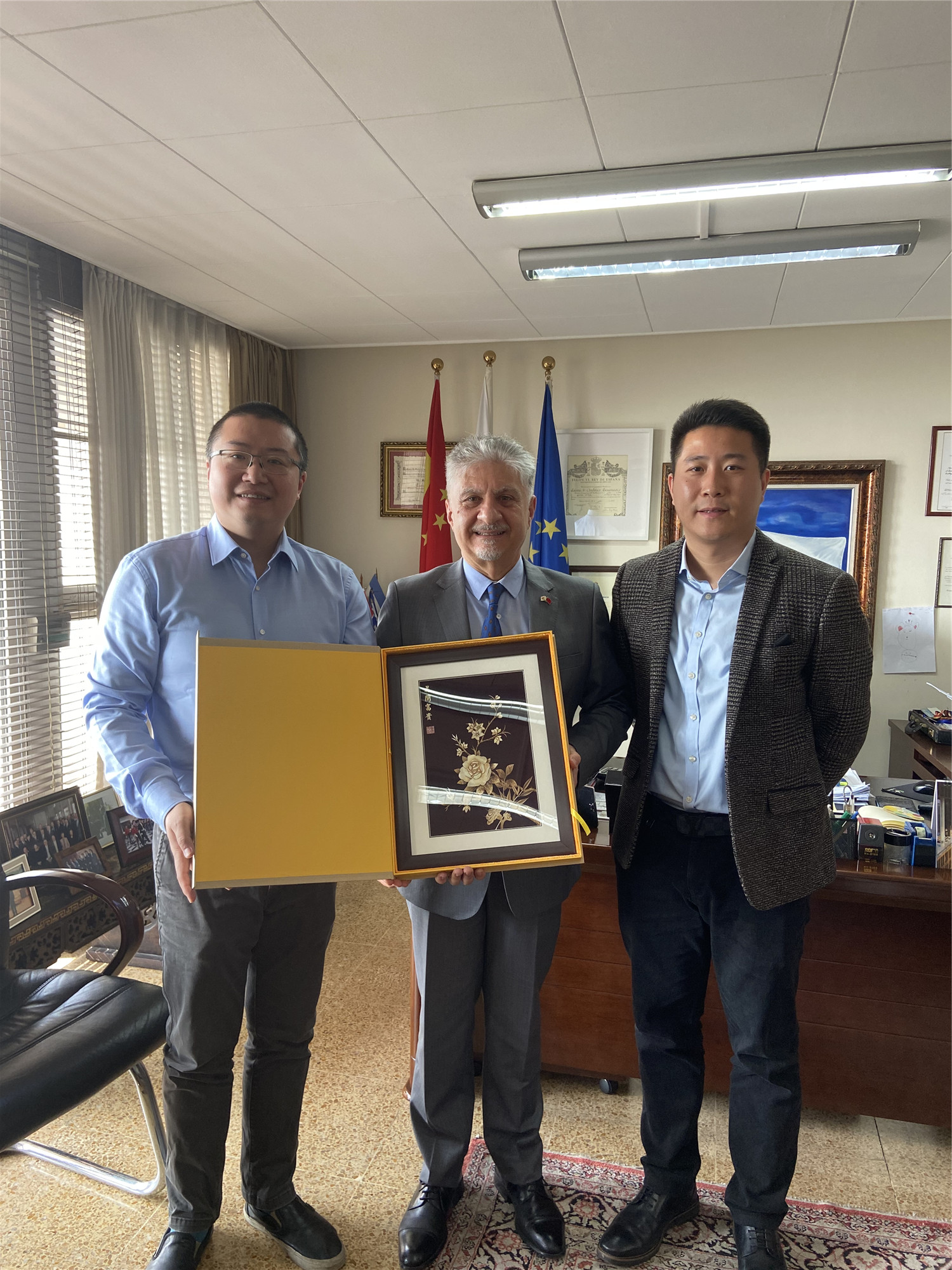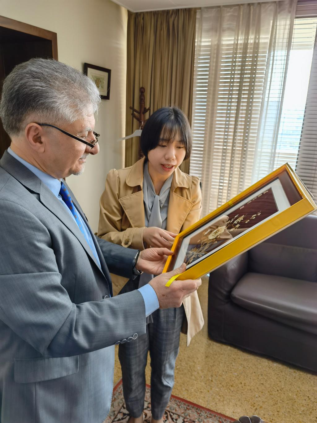 为更好推进我校塞欧学院的成立以及鲁班工坊建设,学校委托塞浦路斯欧洲大学校长助理刘冀亭特意拜访了塞浦路斯驻北京大使馆大使,并转交了贺兴文大师的麦秆画作为伴手礼。刘冀亭向大使汇报了陕财和塞欧开展学术合作以及文化交流活动情况,特别汇报了双方拟开展鲁班工坊合作一事,大使对鲁班工坊开展抱有极大的兴趣和美好的祝愿。