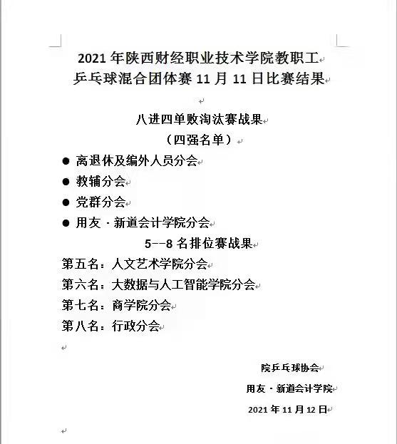 为推动我院乒乓球运动的发展,增强各部门间的交流,展示我院教职工的风采,根据陕财职院工【2021】7号《进一步丰富教职工文体活动的通知》的文件精神,由院工会主办、用友·新道会计学院和乒乓球协会承办、运动与健康管理学院协办的2021年教职工乒乓球团体赛将于2021年11月9日—12日举行。