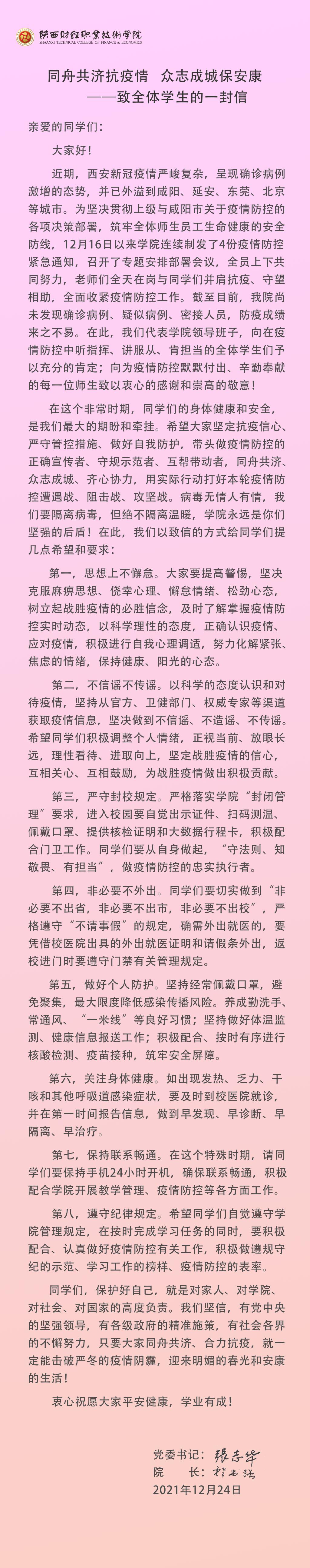 同舟共济抗疫情 众志成城保安康——书记院长致全体学生的一封信