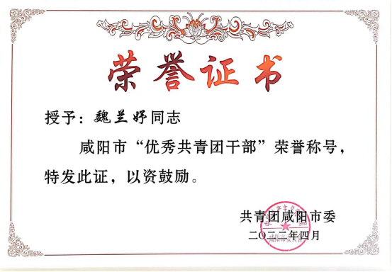近期,共青团咸阳市委下发了2021年度优秀个人表彰文件,我校团委挂职副书记、人文艺术学院专职教师魏兰妤荣获2021年度“咸阳市优秀共青团干部”荣誉称号。