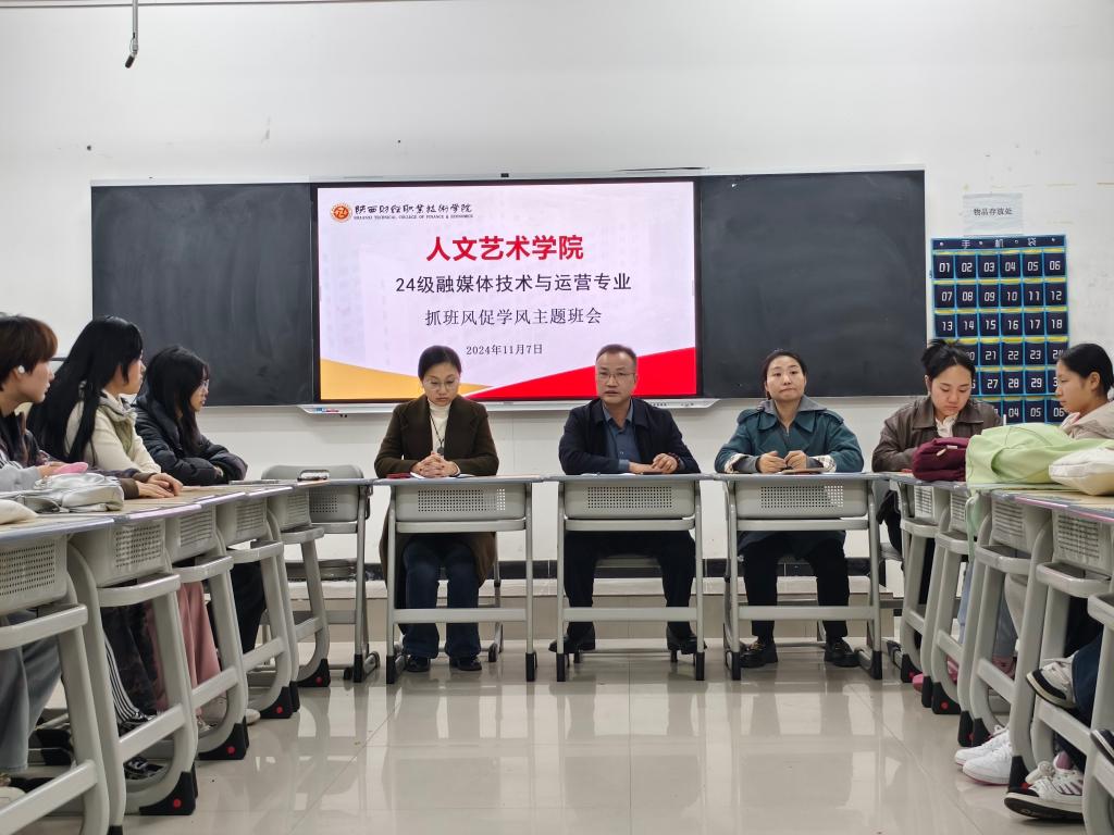 为加强班级学风建设,营造积极向上的学习氛围,11月7日晚自习,人文艺术学院24级融媒体技术与运营1班在420教室举办了“抓班风,促学风”主题班会。本次班会特邀请人文艺术学院党支部书记宋波老师、人文艺术学院教学科科长刘丹柏老师、辅导员巩紫婉老师莅临指导。班会由班主任钱涌宁老师主持。