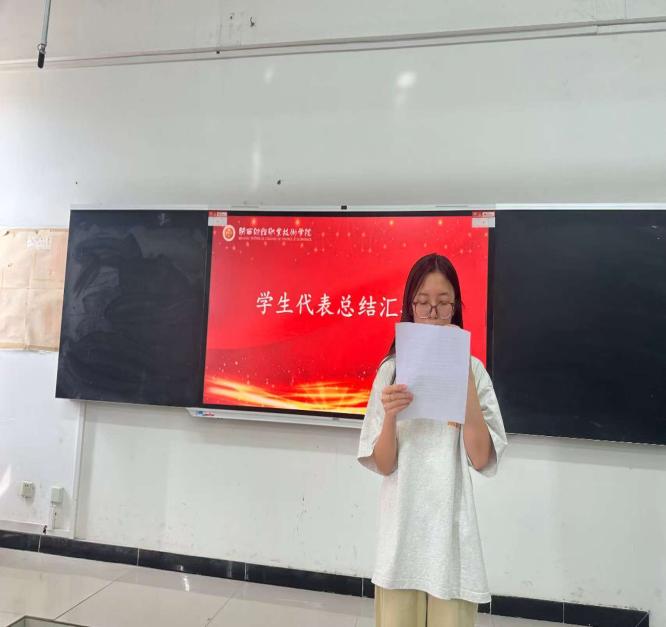 随后,边星月同学作工作汇报展示了本次活动中同学们的成果与收获。这些成就归功于同学们的积极参与、努力付出以及老师的悉心指导和支持,体现了新时代大学生的廉洁自律和良好风貌。