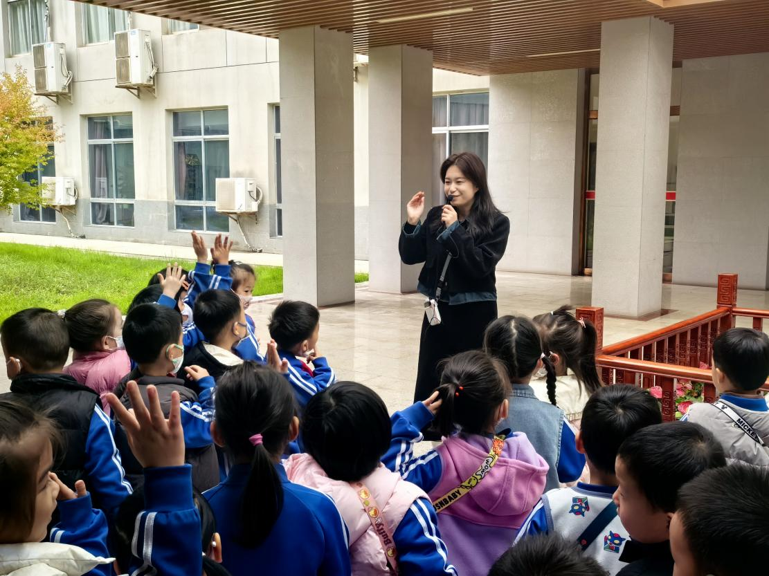 之后,孩子们来到校园内的孔子石像前,刘琴老师结合绘本中“尊师重道”的故事,用通俗的语言讲述孔子“因材施教”“温故知新”的典故,引导孩子们向石像行拱手礼,在庄重的仪式感中萌发对先贤的敬仰之情,理解中华传统美德的内涵。