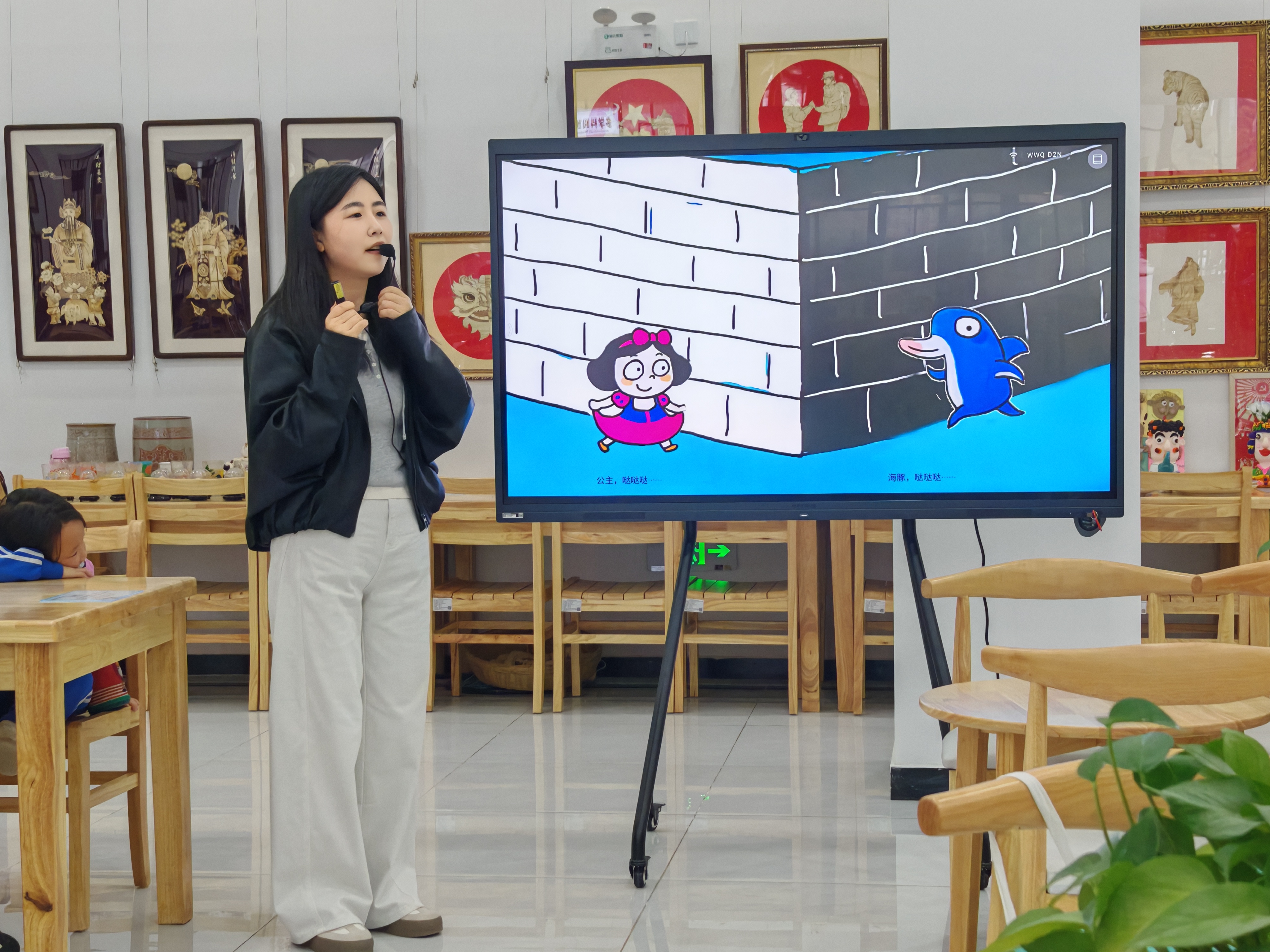 人文艺术学院教师刘维带来的“绘本剧场”环节点燃了活动热潮。刘维老师以《跑跑镇》为蓝本,通过角色扮演、情景演绎的方式绘声绘色地讲解了故事内容,孩子们积极参与互动,在欢声笑语中欣赏绘本。