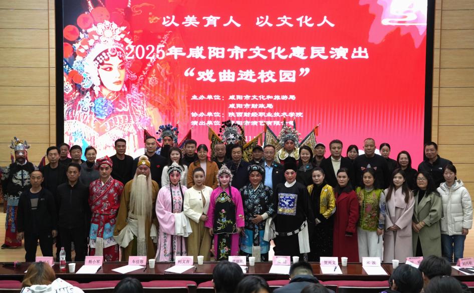 为弘扬中华优秀传统文化,深化校园美育实践,11月10日19:00,陕西财经职业技术学院“高雅艺术进校园”戏曲专场活动在学术报告厅圆满落幕。活动由学院牵头,联合咸阳市演艺有限公司共同举办,特邀咸阳市人民剧团团长、国家一级演员杨小军领衔的艺术家团队倾情献艺。学院党委委员、宣传部部长严丽丽,团委书记张洁,人文艺术学院名誉院长贺兴文等领导莅临现场,与400余名师生共赴传统艺术与美育教育交融的文化盛典